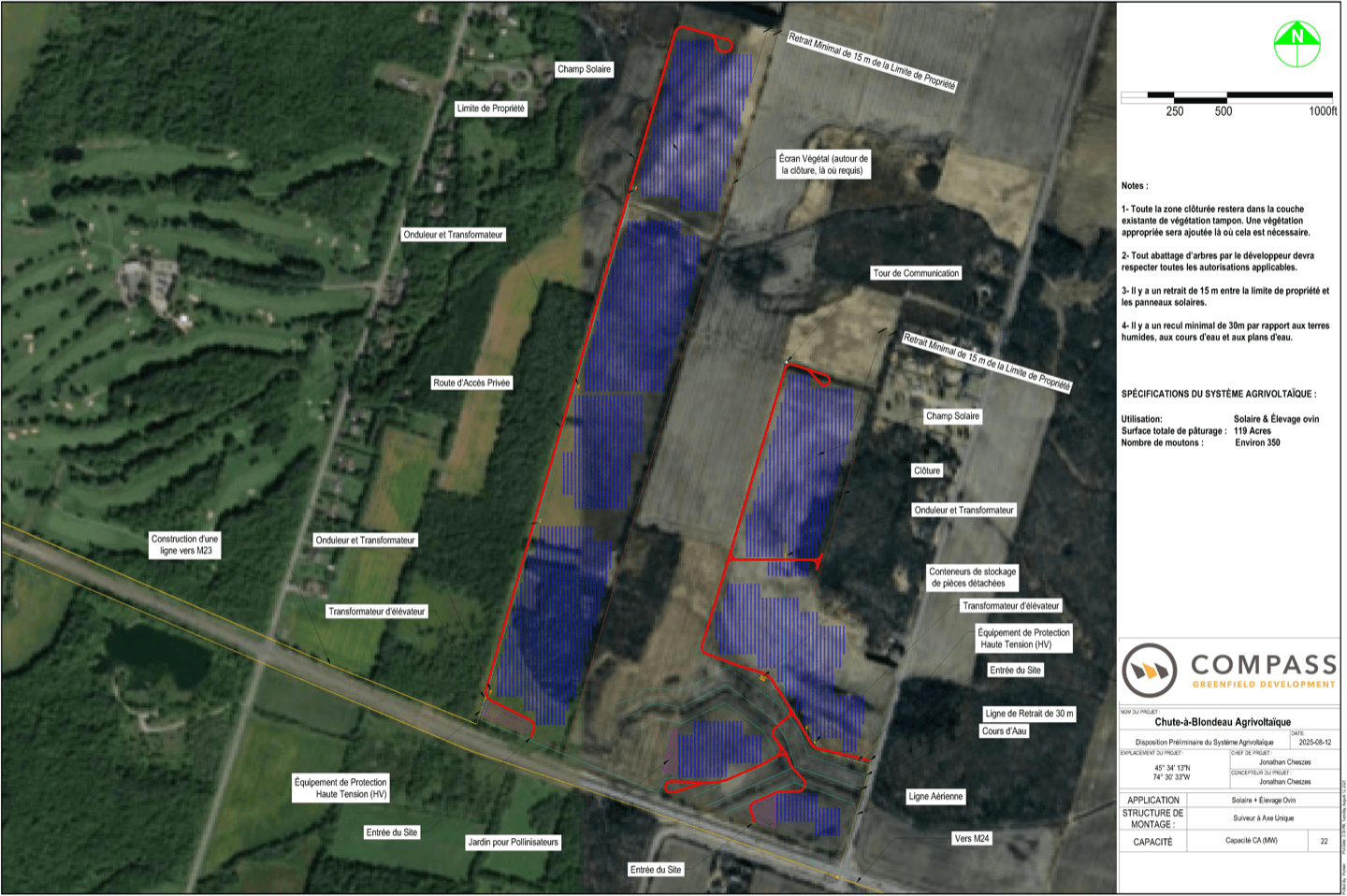 Les directives d'approvisionnement de SIERE et du ministère de l'Agriculture limitent le développement de l'énergie solaire dans les zones agricoles à fort rendement, telles que définies dans la Déclaration de principes provinciale. Le projet Agrivoltaïque de Chute-à-Blondeau est situé sur des terres rurales selon le plan officiel des Comtés unis de Prescott et Russell. La station de transmission locale soutient la capacité des projets, et la propriété du projet sera utilisée pour le pâturage des moutons, et éventuellement pour des cultures cueillies à la main en plus d'être utilisée pour la production d'énergie solaire. Nous avons loué jusqu'à 126 acres de terrain pour ce projet.